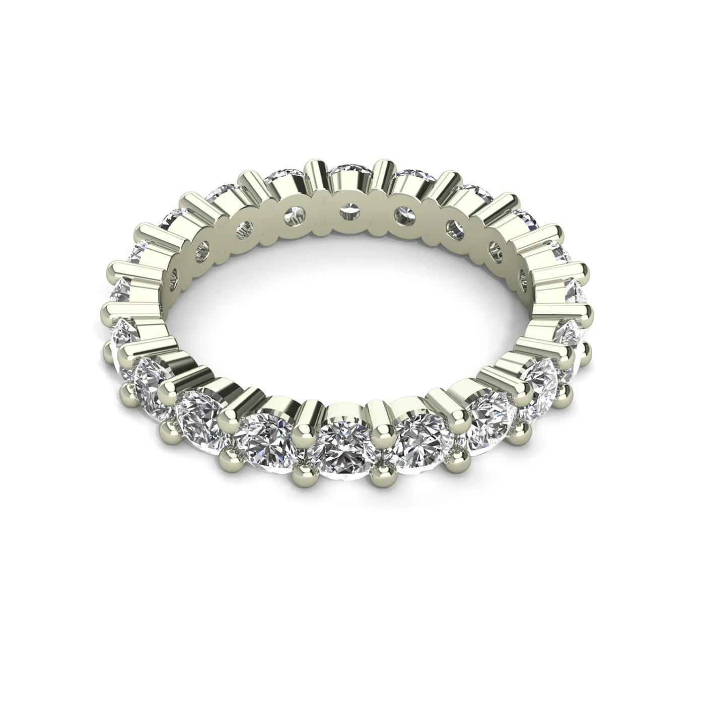 This eternity band beautifully showcases a series of round brilliant diamonds in share-prong setting, creating a captivating piece that is perfect for any special occasion.